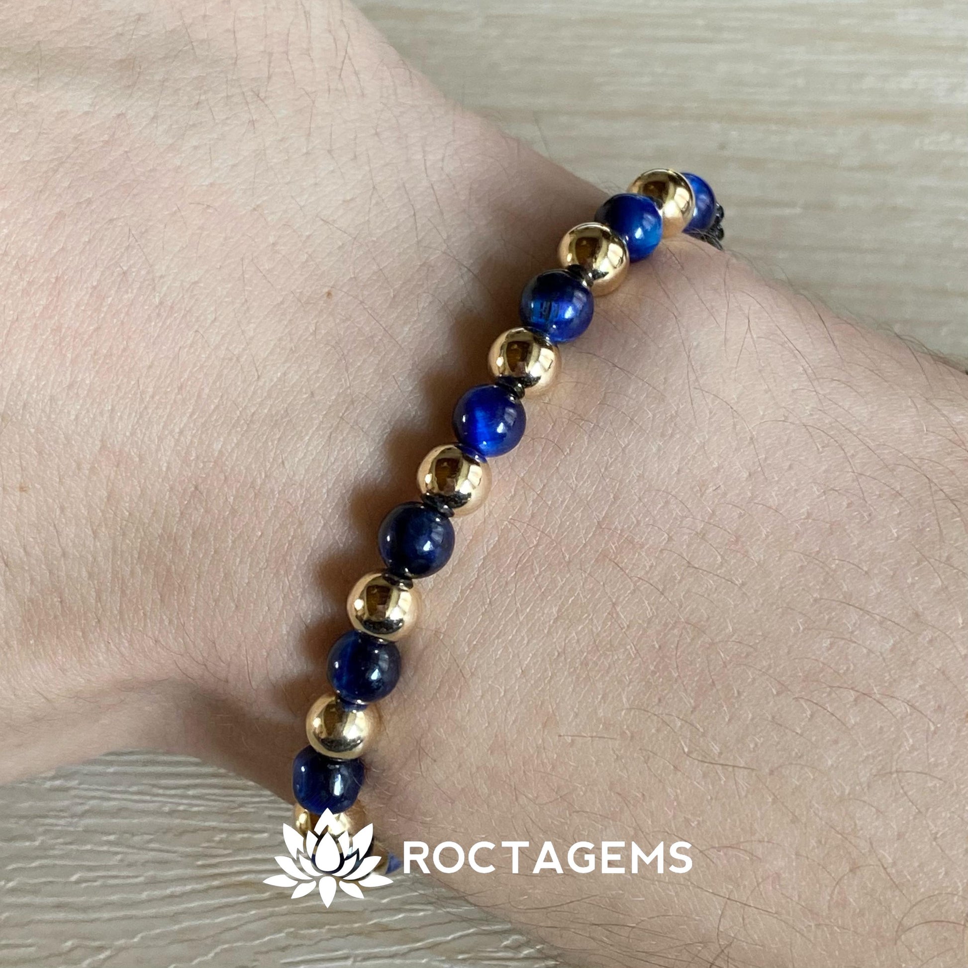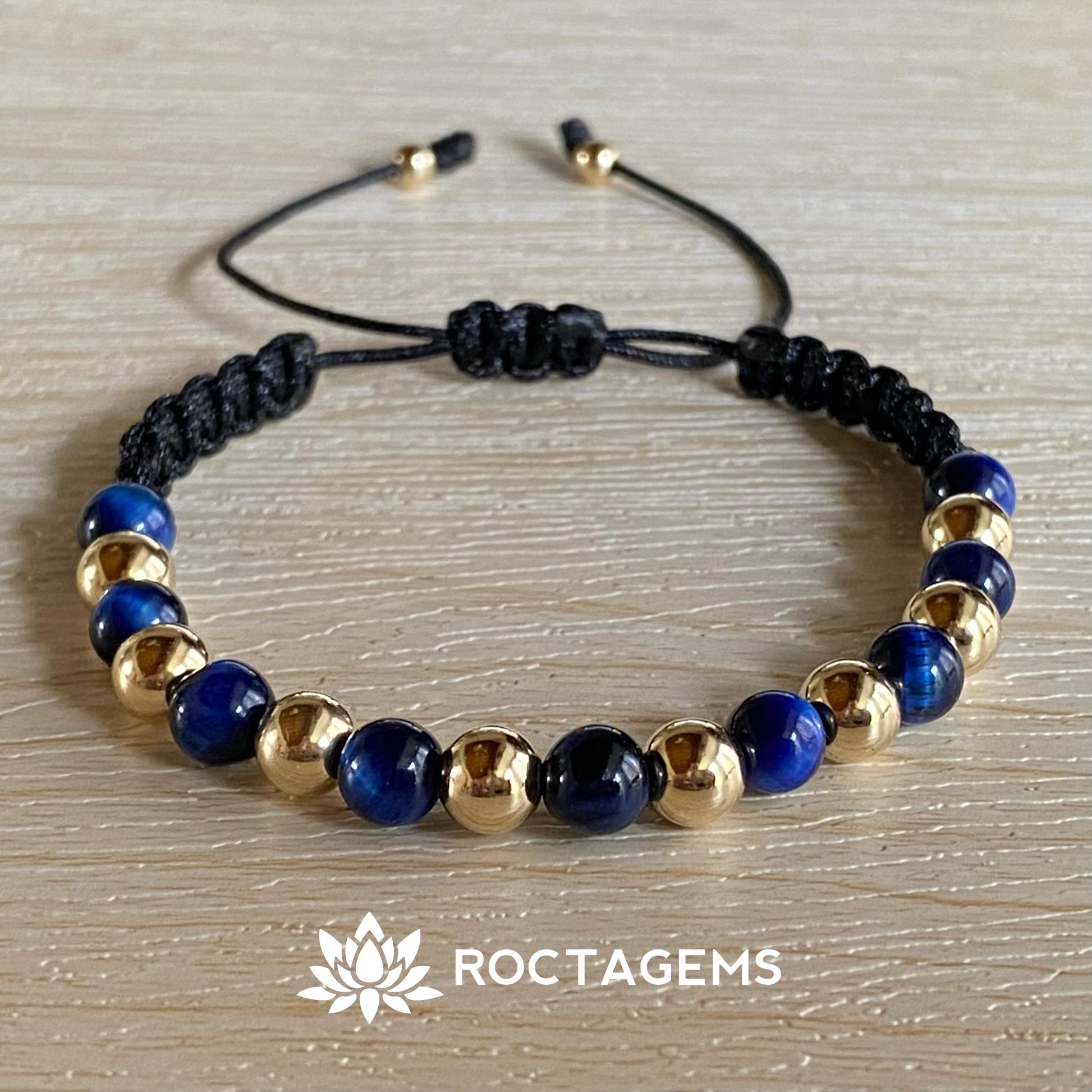 🔅Pulsera elaborada por 8 balines lisos de 6mm en oro laminado 18k y 9 piedras ojo de tigre azul 100% naturales.